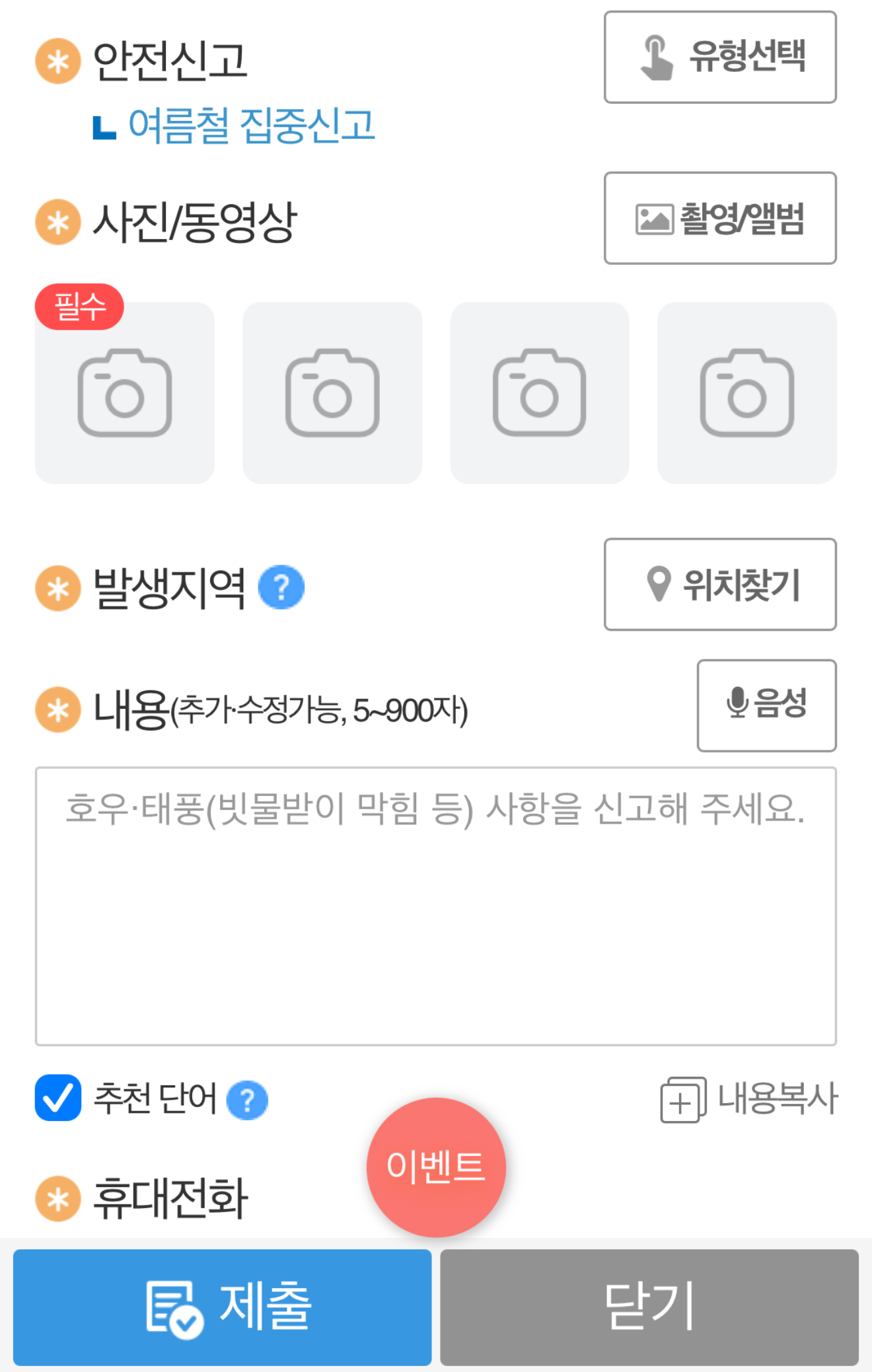 3. 사진/동영상, 발생지역, 내용, 휴대전화 번호를 추가하시고 제출을 해주시면 됩니다.