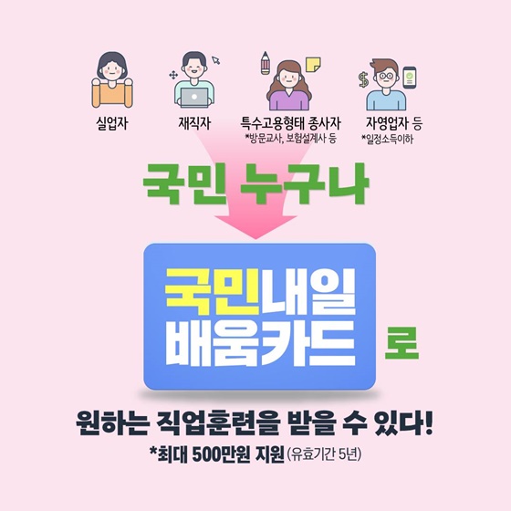 실업자, 재직자, 특수고용형태 종사자(*방문교사, 보험설계사 등), 자영업자(*일정소득 이하) 등 국민 누구나 국민내일 배움카드로 원하는 직업훈련을 받을 수 있습니다.