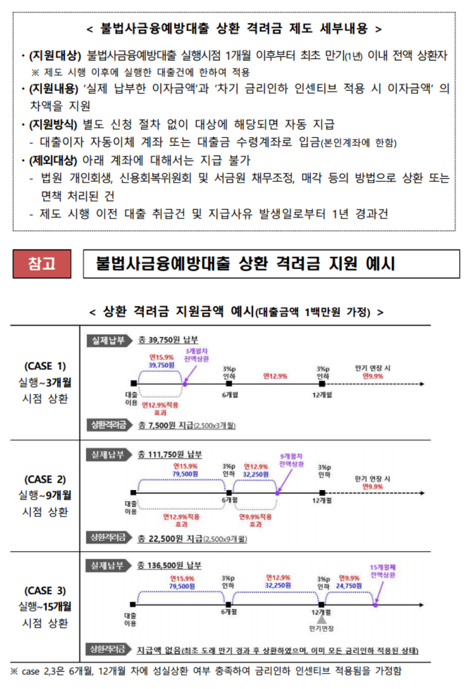 상환 격려금 지원 대상은 불법사금융예방대출 실행시점 1개월 이후부터 최초 만기일 이전 대출원리금을 전액 상환한 이용자가 대상입니다.