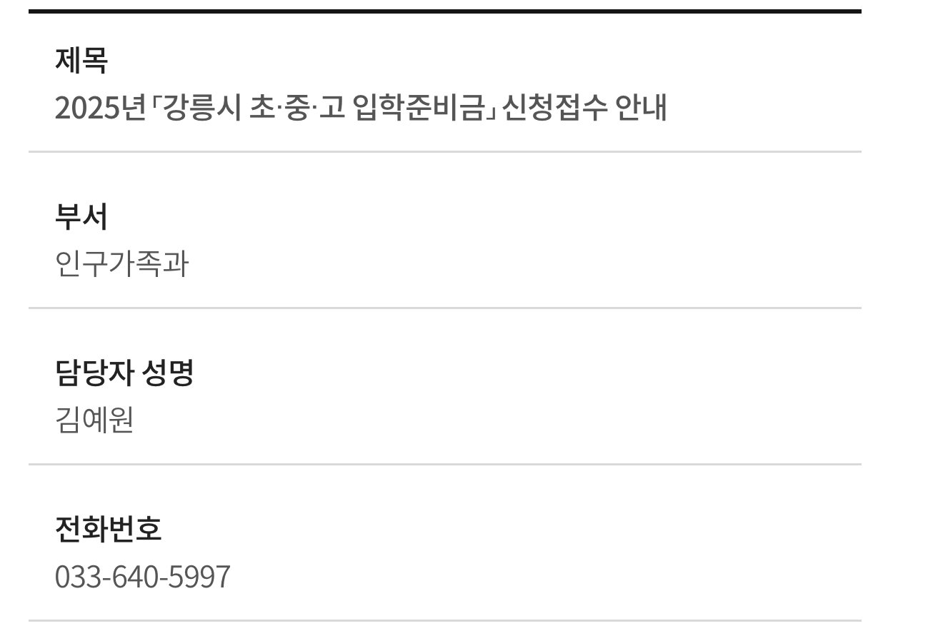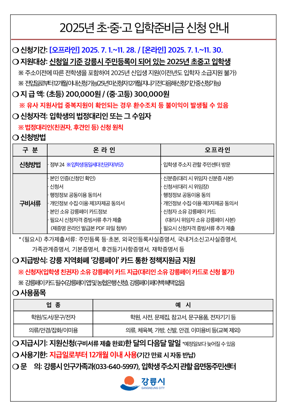 강릉시 인구늘리기 지원에 관한 조례」에 따른 취학 및 진학 자녀 양육 가정의 경제적 부담 경감과 출산 친화적 환경 조성을 위한 「2025년 강릉시 초·중·고 입학준비금」 지원사업을 안내하고 있습니다.