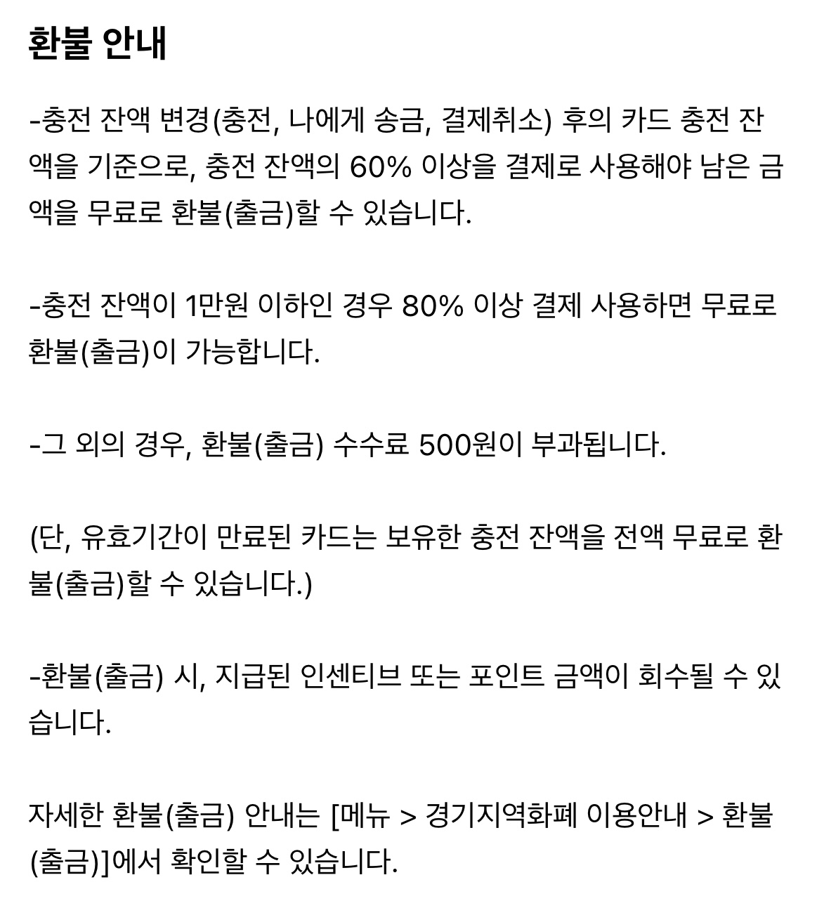 자세한 환불(출금) 안내는 [메뉴 > 경기지역화폐 이용안내 > 환불 (출금)]에서 확인할 수 있습니다.