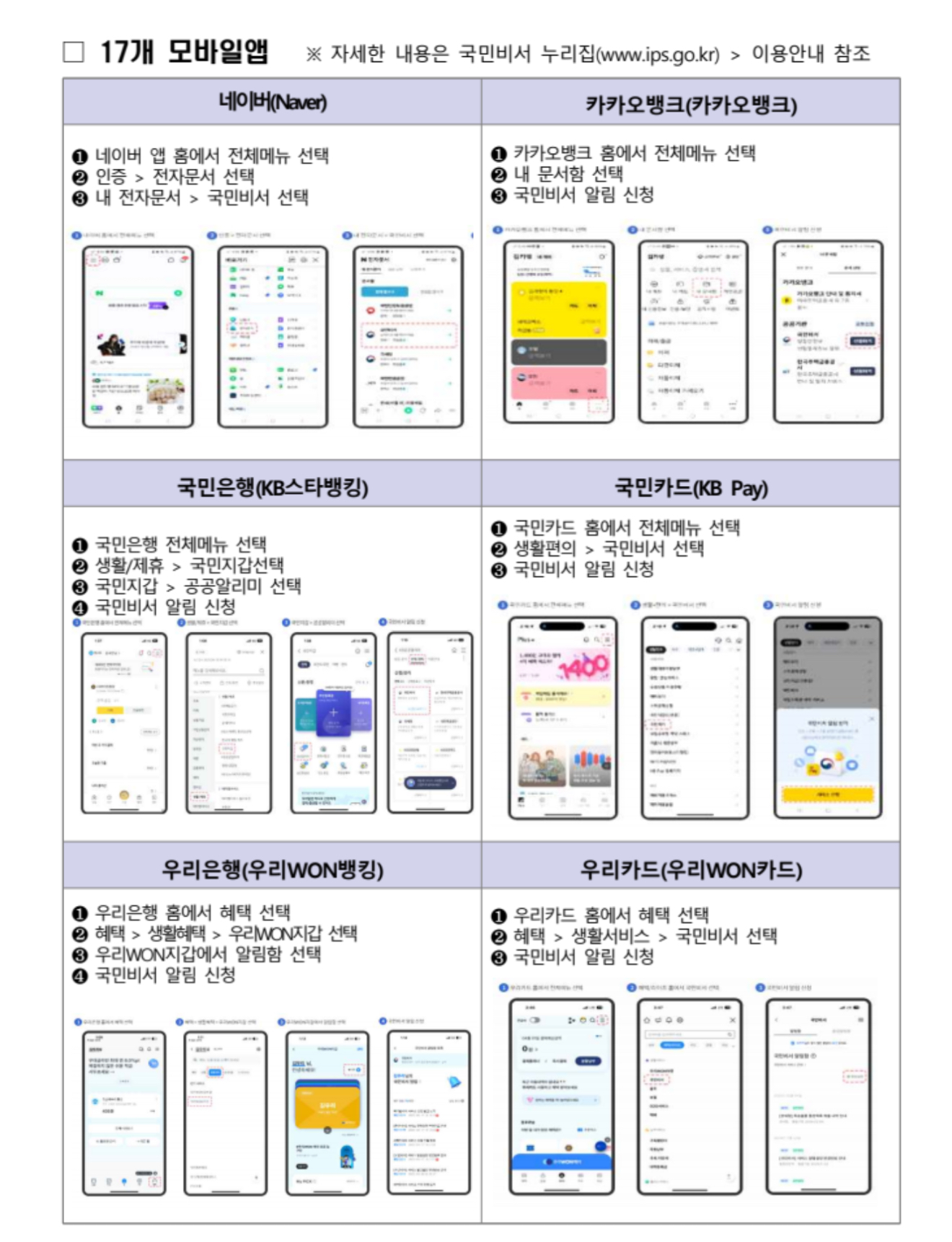 • (17개 모바일 앱) 앱 접속>국민비서 메뉴*>개인정보 수집 등 동의>‘민생회복 소비쿠폰 안내’ 서비스 선택>가입 완료