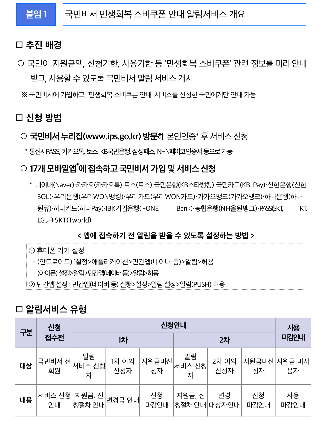 • (국민비서 누리집) 누리집 접속>본인인증>개인정보 수집 등 동의>알림 받고자 하는 모바일앱 및 ‘민생회복 소비쿠폰 안내’ 서비스 선택>가입 완료