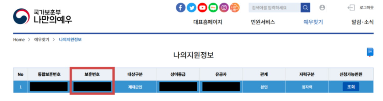※ 국가보훈대상자가 아니거나 등록이 되어있지 않다면 보훈번호 조회가 불가