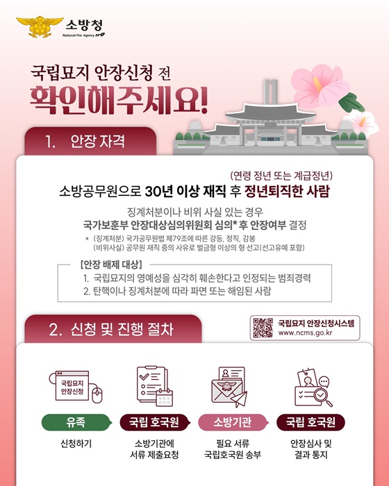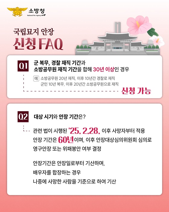 장기 재직 소방공무원의 국립묘지(호국원) 안장은 국민을 위해 헌신한 소방공무원을 예우하고, 제복 공무원에 대한 존중 문화를 확산하기 위해 2025. 2. 28.부터 시행되고 있습니다.