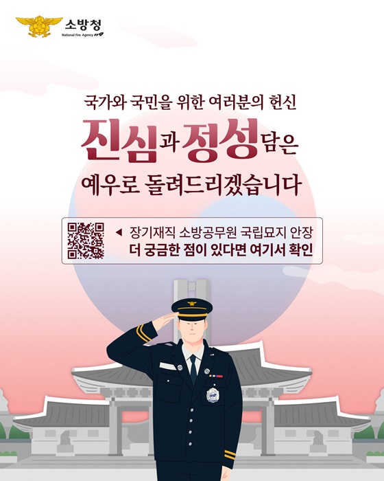 본 설명은 소방청 출처 안내로 기재되었으며 소방청은 국가와 국민을 위한 여러분의 헌신 진심과 정성담은 예우로 돌려드리겠다고 밝혔습니다.