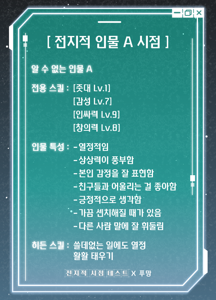 테스트하고 나의 인물 정보와 히든 스킬을 확인해보는 푸망에서 나온 ‘전지적 시점 테스트’를 소개드리겠습니다.