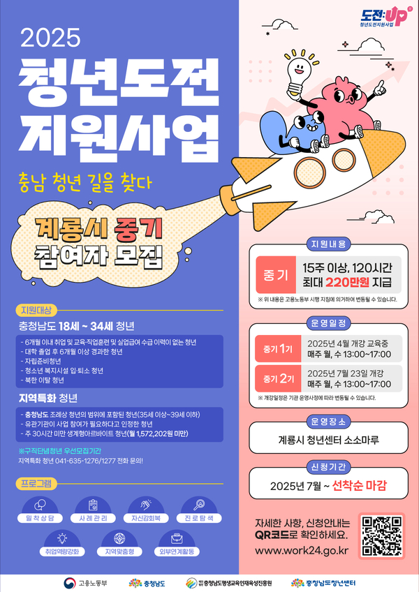 충남 계룡시와 충남도는 고용노동부가 주관하는 ‘청년 도전지원사업’ 하반기 프로그램 참여자를 추가 모집한다고 밝혔습니다.