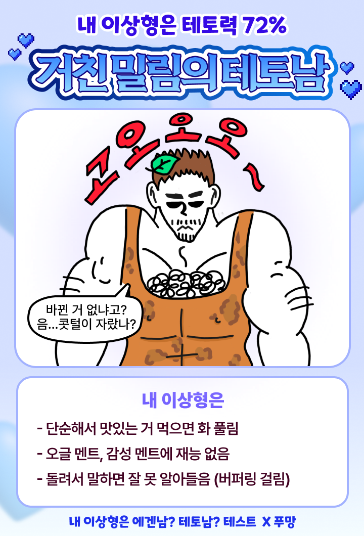 지금 바로 내 이상형을 확인해보는 푸망에서 나온 ‘내 이상형은 에겐남? 테토남?’을 소개드리겠습니다.