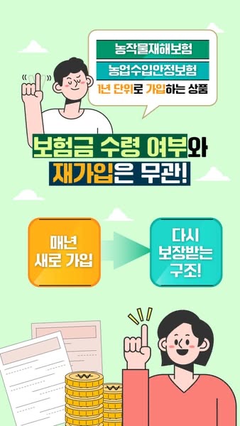 농작물재해보험, 농업수입안정보험 1년 단위로 가입하는 상품이며 보험금 수령 여부와 재가입은 무관하며 매년 새로 가입, 다시 보장받는 구조라고 합니다.