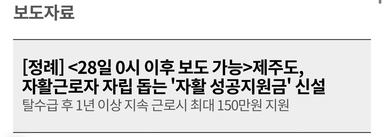 제주특별자치도가 자활근로 참여자의 성공적인 자립을 위해 최대 150만 원을 지원하는 ‘자활성공지원금’ 사업을 2025년 10월부터 신규 시행한다고 밝혔습니다.