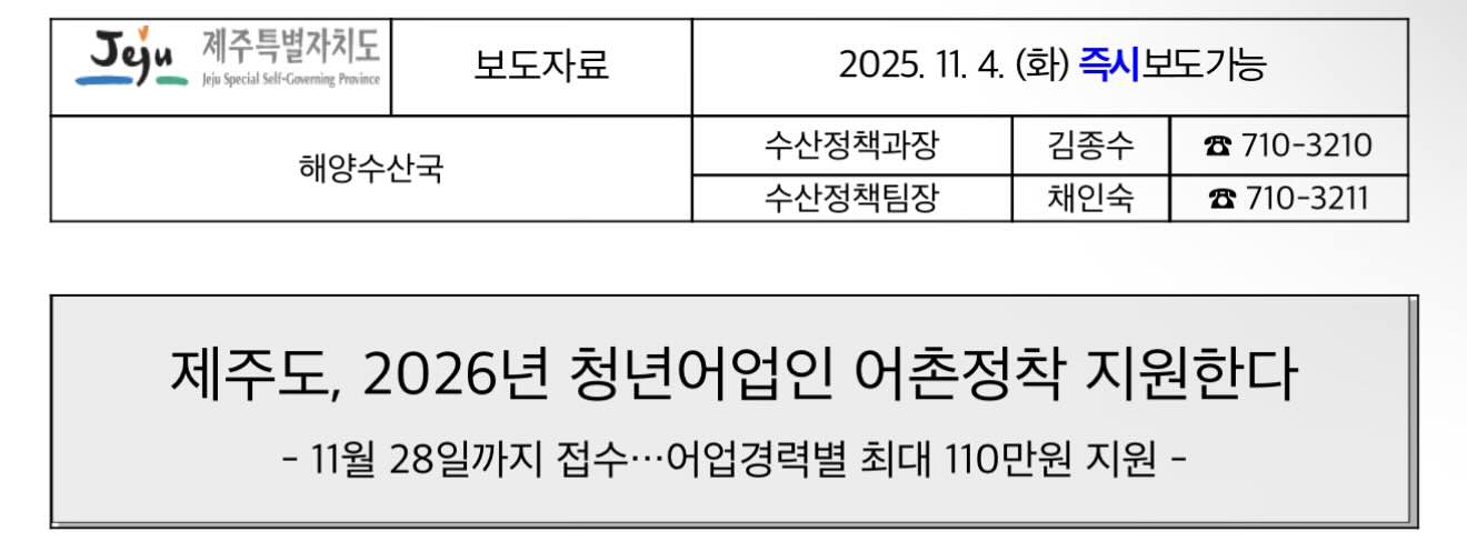 사업 참여를 희망하는 청년 어업인은 오는 2025년 11월 28일까지 제주도 누리집 공고문을 확인한 뒤 제주도청 수산정책과로 직접 방문해 신청하시면 됩니다.