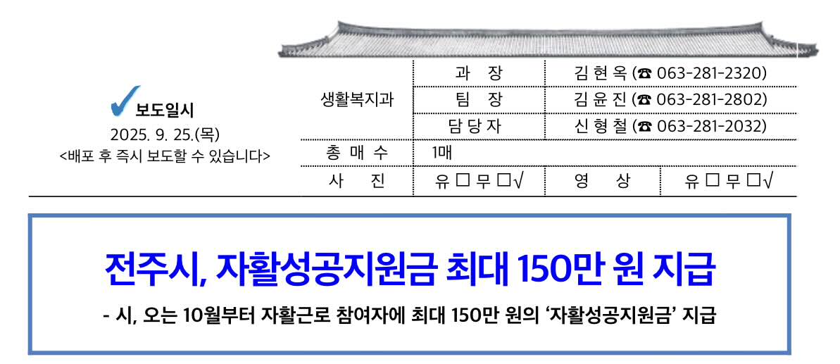 본 설명은 전주시 보도자료 출처 안내로 작성되었으며 김현옥 전주시 생활복지과장은 “이번 성공지원금은 자활근로 참여자의 취·창업과 생계급여 탈수급을 뒷받침해 실질적인 자립으로 이어지도록 하기 위한 것”이라며 “단순한 근로 지원을 넘어 성과와 자립을 보상하는 체계를 마련해 참여자들이 지역사회에서 안정적으로 자리 잡을 수 있도록 지원하겠다”고 말했습니다.