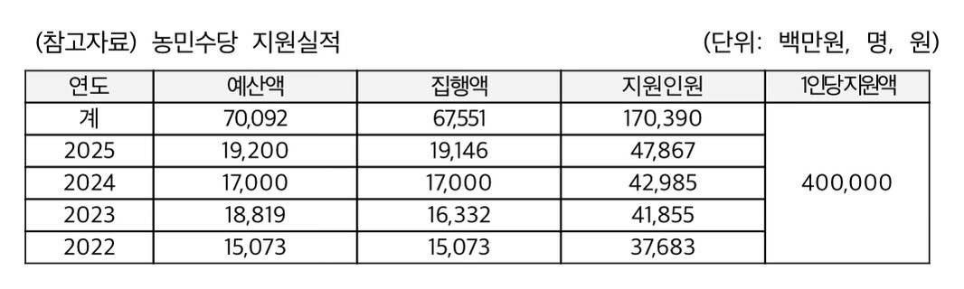 2022년부터 시행된 농민수당은 농업·농촌의 공익적 가치에 대한 사회적 보상 성격으로 그동안 1인당 40만원을 일괄 지원해 왔습니다.