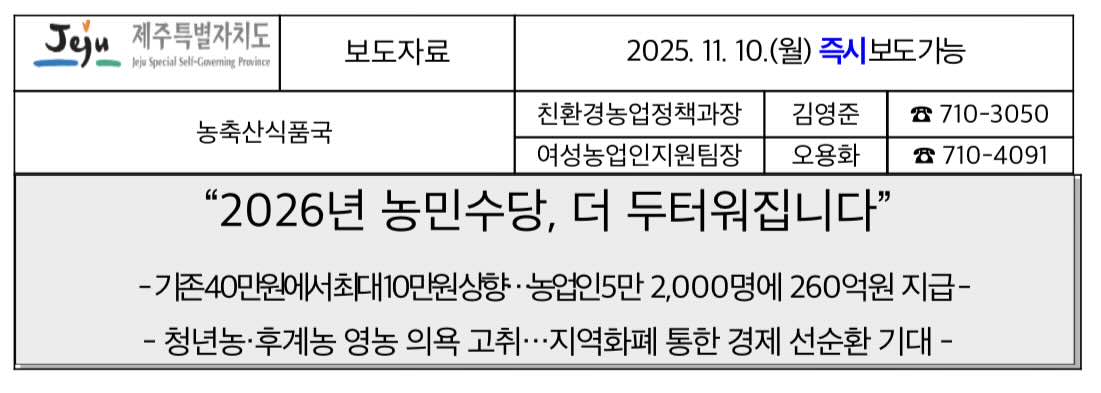 본 설명은 제주특별자치도 출처 안내로 기재되었으며 김형은 제주도 농축산식품국장은 “2026년 농민수당 확대는 농업인의 실질적인 소득 보전과 함께 농업의 공익적 가치를 인정하는 의미 있는 정책”이라며 "농민수당을 지역화폐로 지급해 지역경제 활성화까지 이끌어내는 한편, 청년농·후계농들이 안정적으로 농업에 종사할 수 있는 든든한 기반을 마련하겠다”라고 말했습니다.