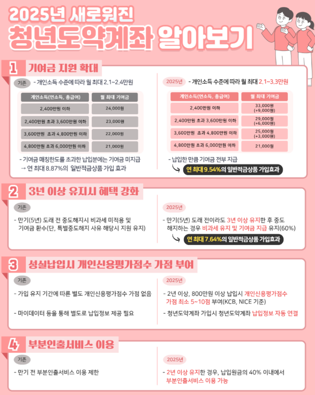 이 외에도, 2년 이상 가입을 유지하고 800만원 이상 납입할 경우 개인신용평가점수가 5~10점 이상 자동적으로 부여된다(NICE, KCB社 기준). 2년 이상 가입을 유지할 경우 납입원금의 40% 이내에서 부분인출할 수 있는 부분인출서비스는 2025년 하반기 중에 시행되어 청년들이 계좌를 보다 꾸준히 유지할 수 있도록 할 예정이라고 합니다.