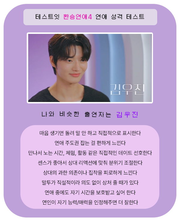 테스트잇이라는 사이트에서 ‘환승연애4 연애 성격 테스트’라고 등장했는데 나와 닮은 출연자 유형은 누군지 맞춰보시길 바랍니다.