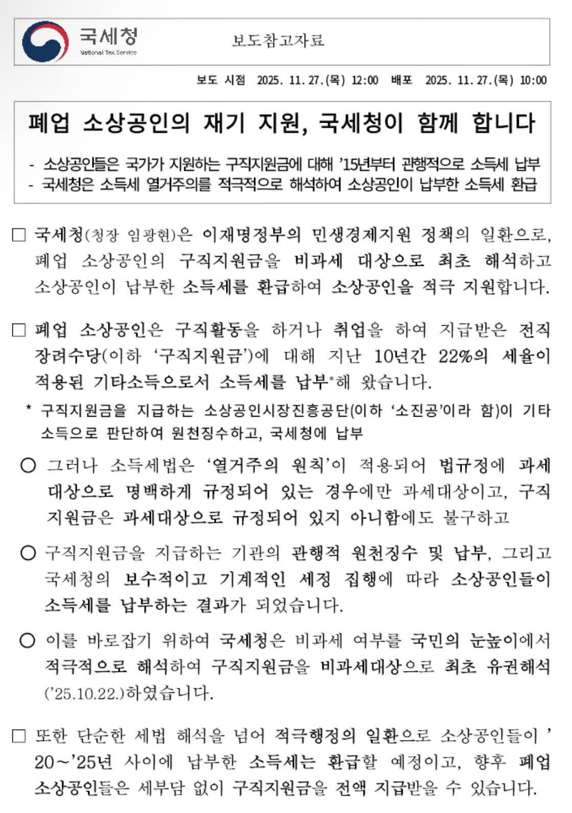 이를 바로잡기 위해 국세청은 비과세 여부를 적극적으로 해석하여 구직지원금을 비과세 대상으로 최초 유권해석했다며 또 단순한 세법 해석을 넘어 적극 행정의 일환으로 소상공인들이 2020∼2025년 사이에 납부한 소득세는 환급할 예정이라고 합니다