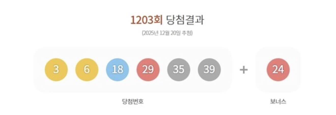 제1203회 로또 추첨에서 1등 당첨 번호는 '3·6·18·29·35·39'