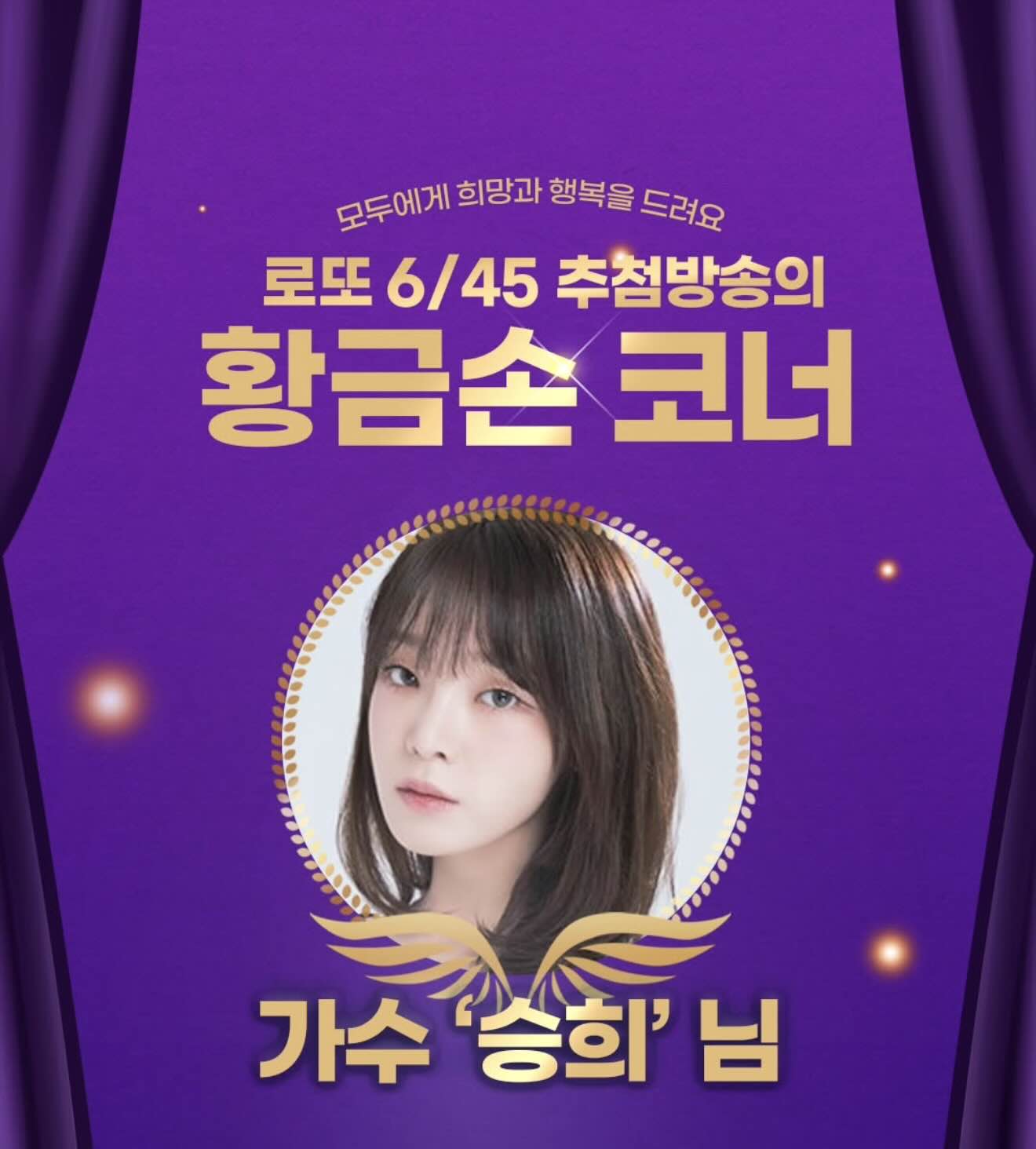 로또 ‘황금손’ 출연을 앞두고 승희는 “평소 복권에 관심을 갖고 작은 당첨의 꿈을 품어왔는데, 당첨 번호를 추첨하는 자리에 서게 되어 더없이 뜻깊고 행복하다”라며 “시청자 여러분이 한 해를 조금 더 따뜻하게 마무리할 수 있도록 진심을 다해 응원하겠다”라고 소감을 전했습니다.