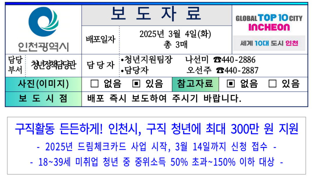 인천광역시(시장 유정복)는 미취업 청년의 구직활동을 지원하는 ‘2025년 드림체크카드 사업’ 참여자를 오는 2025년 3월 14일까지 모집한다고 합니다.