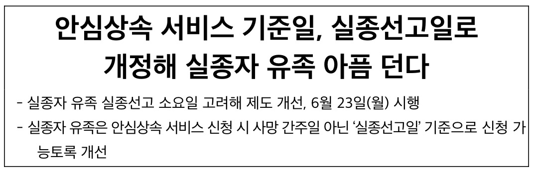 이에 따라 행정안전부는 실종자는 사망일이 아닌 실종선고일을 기준으로 1년 이내 안심상속서비스를 신청할 수 있도록 예규를 개정했다고 합니다.