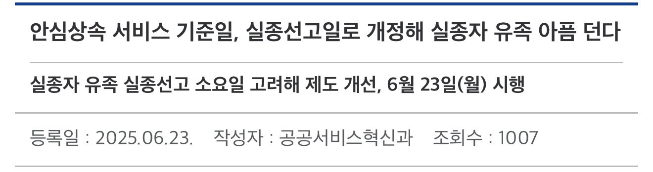 이번 제도 개선으로 실종선고를 받은 유족은 기존 신청 기한 제한으로 안심상속 서비스를 활용하지 못하는 어려움을 해소하고, 실종선고일 이후에도 상속 재산 조회 신청이 가능해지게 됩니다.