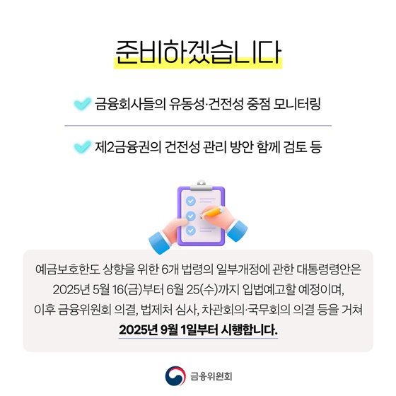 예금보호한도 상향을 위한 6개 법령의 일부개정에 관한 대통령령안은 2025년 5월 16(금)부터 6월 25(수)까지 입법예고할 예정이며, 이후 금융위원회 의결, 법제처 심사, 차관회의·국무회의 의결 등을 거쳐 2025년 9월 1일부터 시행한다고 합니다.